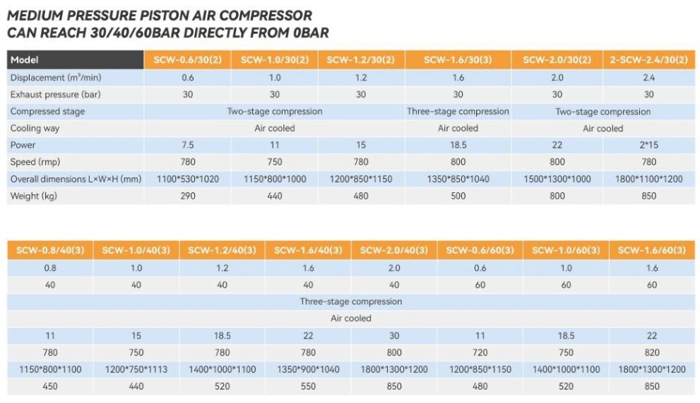 Với thiết kế đặc biết cho trung áp và cao áp, máy piston có thể nén tờ 0 Bar lên đến 30Bar/ 40Bar/ 60Bar